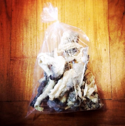 Whichever fish skin is used, they are first cleaned and scaled, etc., then dipped into a light batter and then deep fried until just crisp. Not all Fried Fish Skins are created equal, though, especially as these fried fish skins are usually made in the shop where you buy them. One should look for bags that are very, very tightly sealed (humidity is the great crunch deflator) and fish skins that are thin, have a light, even coating of batter and look freshly fried in clean and new oil. Old oil spoils the taste and gives the fried skins a darker golden color. The fish skins in the bag should feel crackly and light just like a bag of potato chips feels.