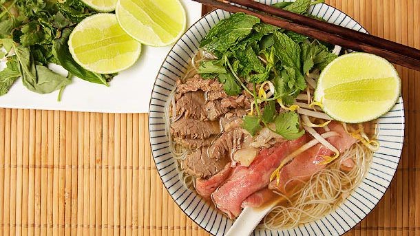 Traditional pho is made by simmering beef bones and meat along with a few aromatics for around 6 hours, straining the broth, then serving it with the cooked meat, some sliced raw meat, hydrated rice noodles and other garnishes.