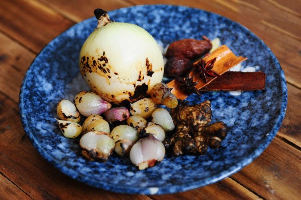 Outside of the meat, the basic flavors of pho are pretty simple: charred onions and ginger (or a bit of sweetness, smoky depth, and pungency), star anise, cinnamon, cloves, and occasionally other spices (for aroma), fish sauce (for salt and its savory umami qualities), sugar (for sweetness, duh), and a slew of stir-in herbs and such at the finish.