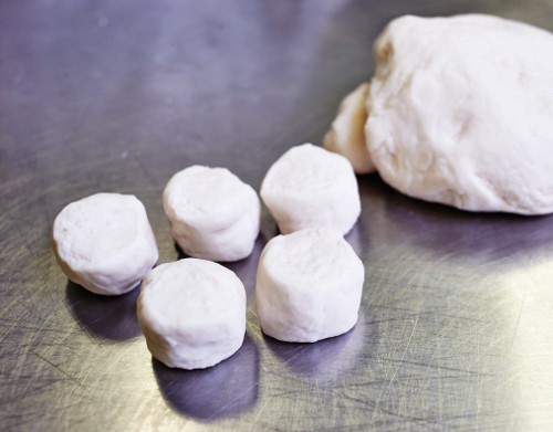4. To make the dough, combine all the ingredients for it in a large bowl and mix until smooth – about 20min by hand, or 10min in an electr ic mixer fitted with a dough hook. The dough should “bounce” back easily when you push a finger into it. Flour a clean tabletop. Divide the dough into 30g portions and roll each piece into a ball. Use your hand to roughly flatten the balls into circular discs, about 0.5cm thick.